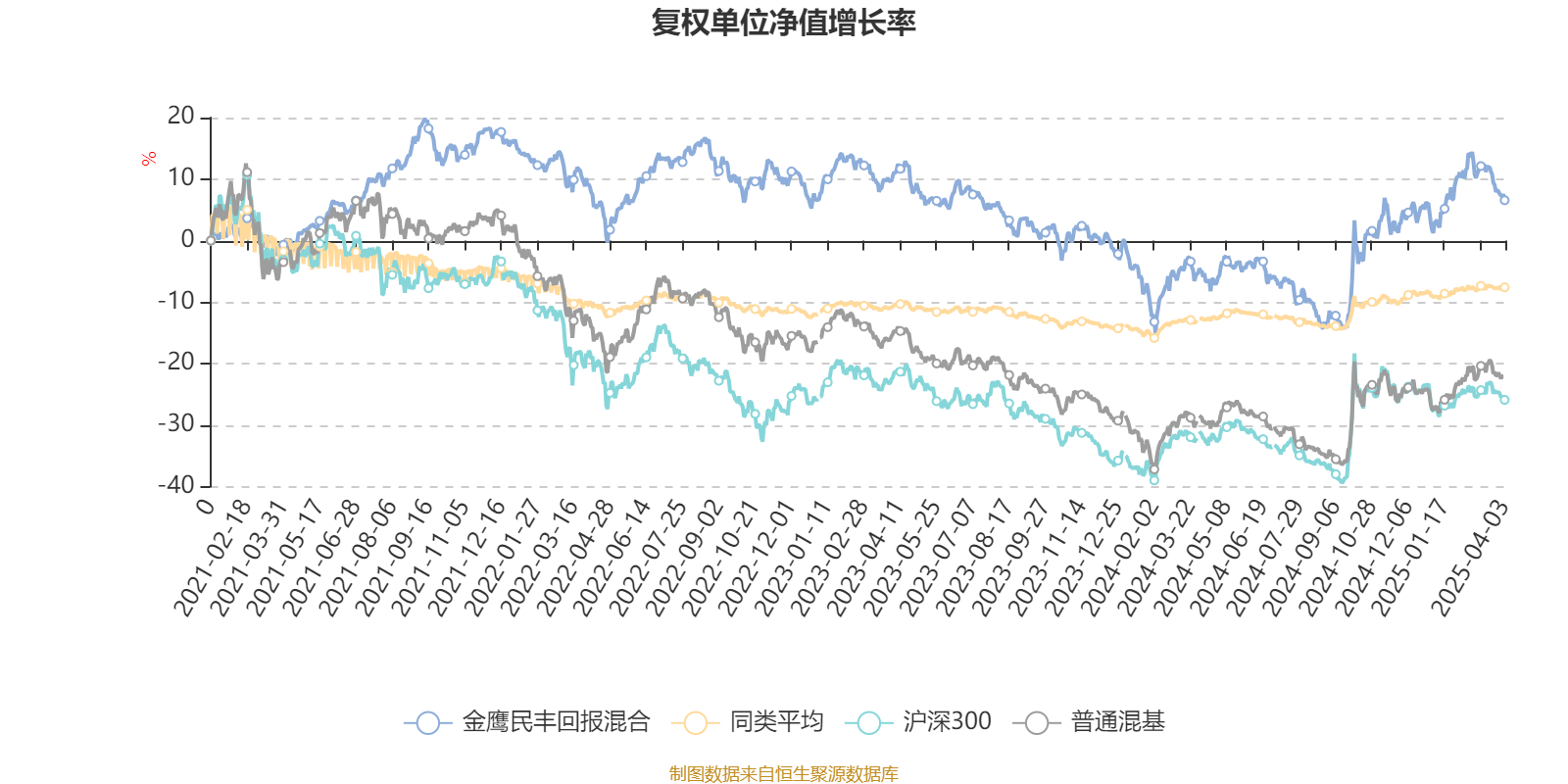 截至4月3日,金鹰民丰回报混合近三个月复权单位净值增长率为4.81%,位于同类可比基金37/670;近半年复权单位净值增长率为8.41%,位于同类可比基金22/670;近一年复权单位净值增长率为12.14%,位于同类可比基金26/667;近三年复权单位净值增长率为-2.38%,位于同类可比基金498/559。